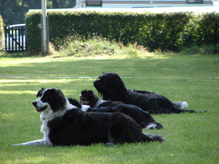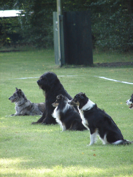 Mushu beim Absitzen und Abliegen in der Gruppe (Bundessiegerprüfung 2005)