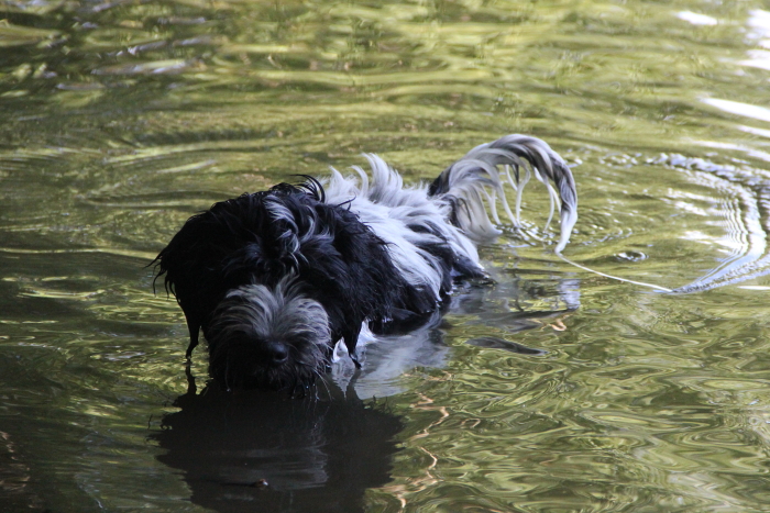 Der „Kleine“ – er ist mit 44cm tatsächlich klein – ist ein energiegeladener Clown mit einer unbändigen Lebensfreude und einer Menge „Schalk im Nacken“. Er ist eine begeisterte Wasserratte und mit gerade mal 12 Wochen das erste Mal Schwimmen gegangen, das habe ich vorher tatsächlich noch bei keinem unserer Hunde erlebt. Auch im Rahmen der regelmäßigen Physiotherapie weiß er Wasser sehr zu schätzen und würde am liebsten gar nicht mehr runterkommen vom Unterwasserlaufband. Die diversen Übungen zur Therapie findet er auch klasse, auf die manuelle Behandlung würde er zugunsten dieser dann verzichten. Während er die Physiotherapie insgesamt sehr gerne besucht, hat seine Begeisterung für tiermedizinische Behandlungen verständlicherweise etwas gelitten und findet er auch die meisten pflegerischen Notwendigkeiten eher überflüssig.