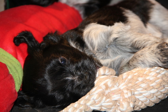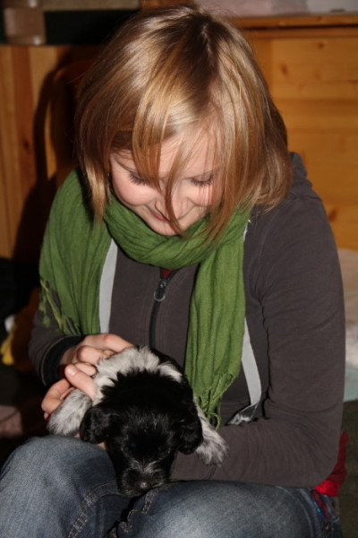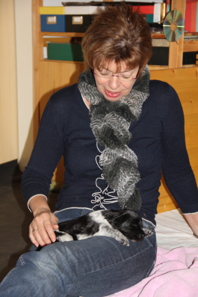 Es wurden intensive Kuschelstunden absolviert und getestet, wie die Hände, Füße, Haare und Kleidung unbekannter Personen sich vom Geruch her und natürlich geschmacklich von denen der bekannten unterscheiden. Noch auf eine sehr sanfte Tour, was sich spätestens für die Besucher der kommenden Woche ändern wird, denn dann sind die kleinen spitzen Welpenzähne da, die ersten haben sich gegen Ende der Woche nämlich schon angekündigt. Die Vergleichstests verliefen offensichtlich positiv, denn die Besucher wurden voll in Beschlag genommen, vorausgesetzt, man hat sie nicht gerade verschlafen, aber das lässt sich natürlich auch verbinden…