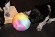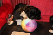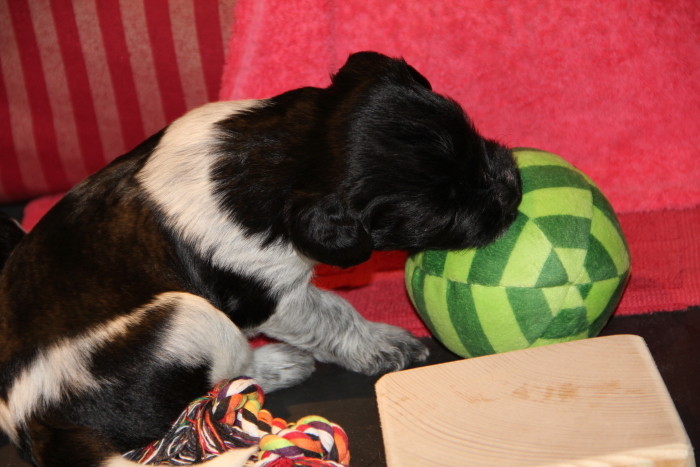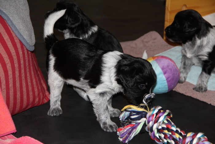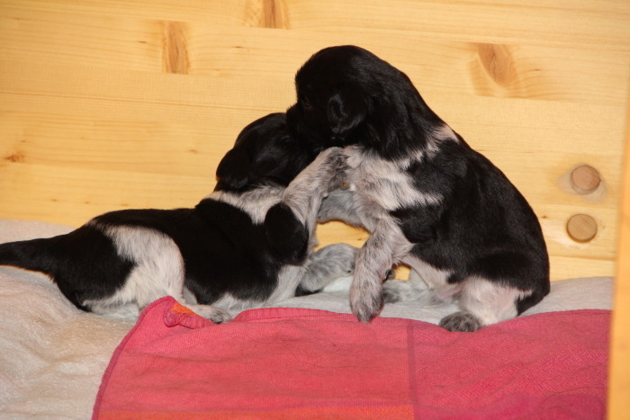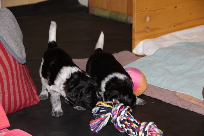 Insgesamt sind die aktiven Phasen in dieser Woche aber deutlich länger geworden und die Welpen beschäftigen sich immer intensiver miteinander und mit ihrer Umgebung. Das gemeinsame Spiel ist zurzeit wieder etwas weniger lautstark, was aber nicht bedeutet, dass man sich gegenseitig nicht ordentlich knufft und aneinander zieht. Vorhandenes Spielzeug wird immer aktiver angespielt, wobei neue Gegenstände zunächst vorsichtig beäugt werden und dann ganz schnell in Beschlag genommen sind. Der Auslauf wird nun bis in die letzten Ecken und Winkel untersucht und genutzt und die Bande fängt an, erste eigene Gestaltungsvorschläge einzubringen. Die Bewegungen werden immer gekonnter und mittlerweile gibt es die ersten übermütigen Galoppsprünge zu beobachten.